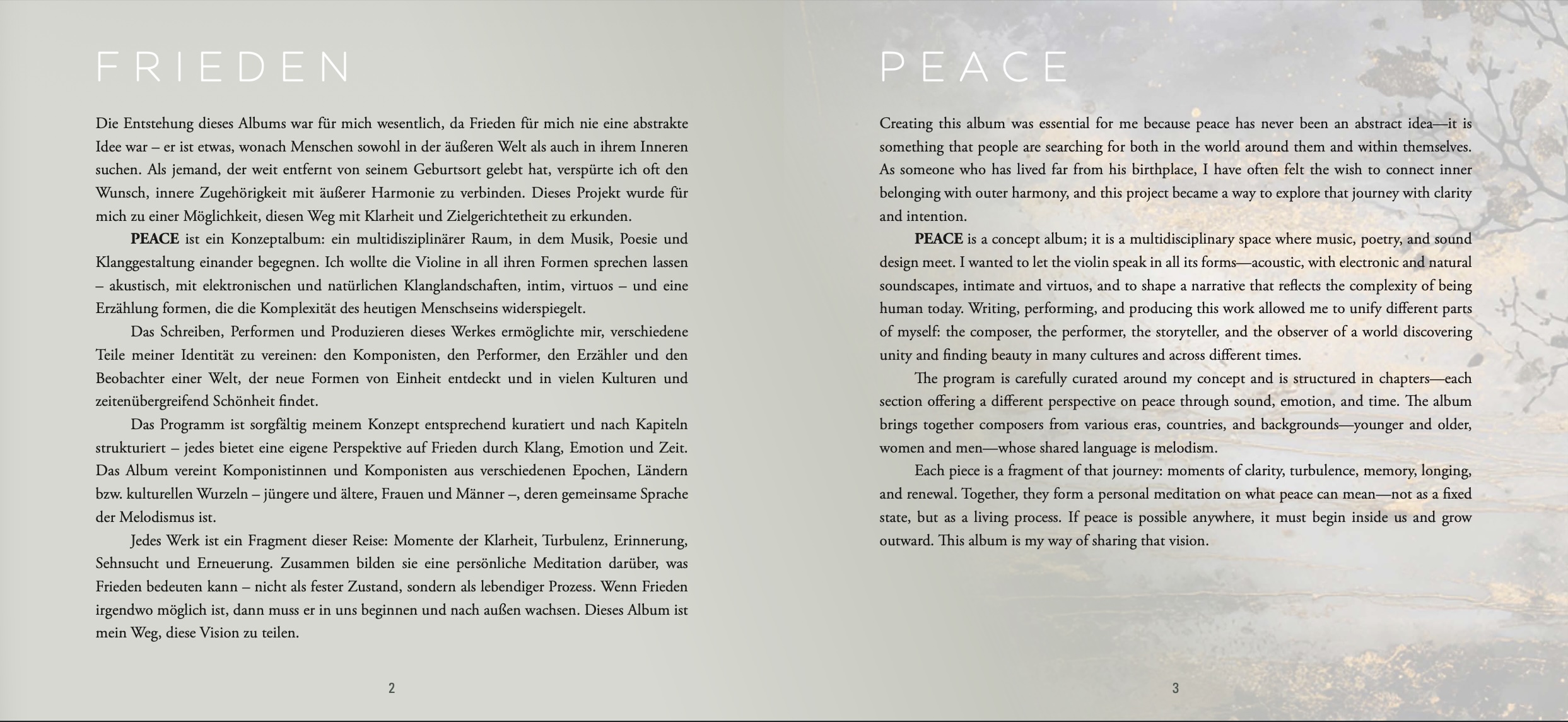 PEACE is a concept album conceived as a multidisciplinary space where classical repertoire, contemporary voices, poetry, and sound design meet.